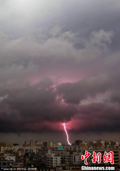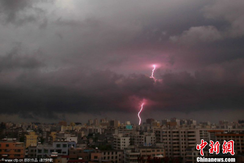 2011年6月22日下午,受今年第4号热带风暴“海马”影响,海口市上空乌云密布,电闪雷鸣。当天下午17时,省气象台发布台风蓝色预警,同时发布暴雨蓝色预警和地质灾害气象等级预报。张杰 摄 图片来源:CFP视觉中国