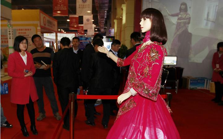 在资本交易大会的展示会上,临沂市云计算中心把有语音对话、人机互动的智能仿真机器人搬到现场,让机器人现场宣传。