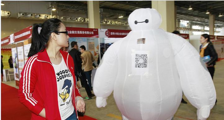 4月17日上午,中国·临沂第二届资本交易大会暨金融创新产品展示会,一家企业用“大白”宣传。