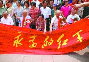 昨日,来到现场的几名老红军坐在一起,准备合影。本报记者 韩萌 摄