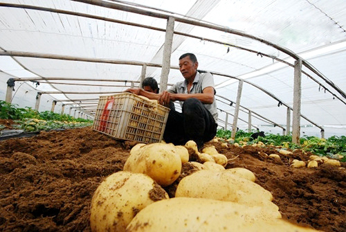 图为该镇大棚果菜种植专业村邱上村村民喜收马铃薯。