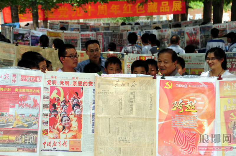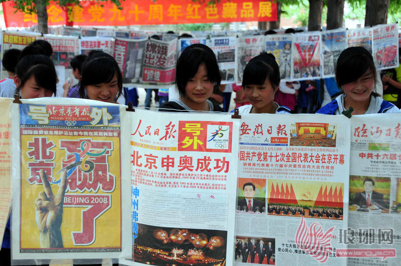 当日,“纪念建党90周年红色藏品展”在山东省临沂市郯城县港上镇第一中学举行,共展出该县退休教师丁思德收藏的报道党代会的各种报刊等藏品200余份。这些“党报”浓缩了中国共产党成立90年来的光辉历程,展示了改革开放以来我国所取得的伟大成就,给师生们上了一堂有意义的“党课”。