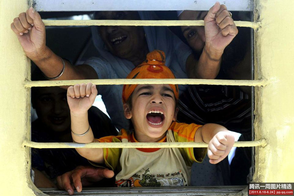 当地时间2011年6月21日,印度阿姆利则,锡克教徒在火车上冲窗外送别的亲人高呼告别,他们将前往巴基斯坦,参加Maharaja Ranjit Singh去世172周年纪念仪式。Maharaja Ranjit Singh被印度人尊为“旁遮普的雄狮”,他曾经统一了整个旁遮普地区。