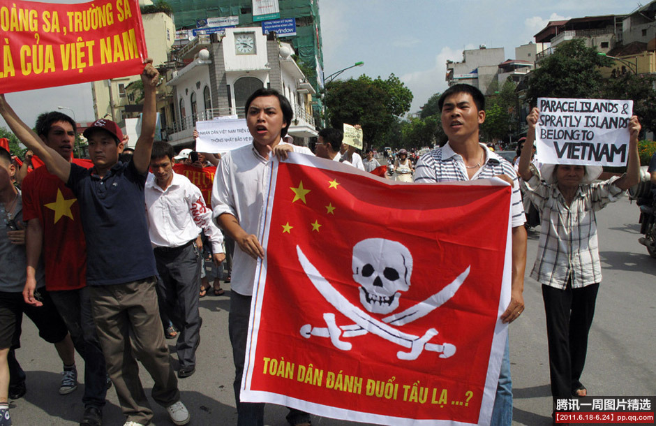 6月19日,大约100名示威者拉着横幅和标语游行到河内市中心的中国大使馆附近,歌唱爱国歌曲和大叫打倒中国的口号,要求中国远离有争议的南海水域。有示威者表示,希望越南政府邀请国际观察员到南海证明越南没有违反国际法,要求中国也遵守国际法。越南示威很少见,但近三周,当局都容许示威者游行。这是越南连续第三个周末出现针对中国的示威活动。
