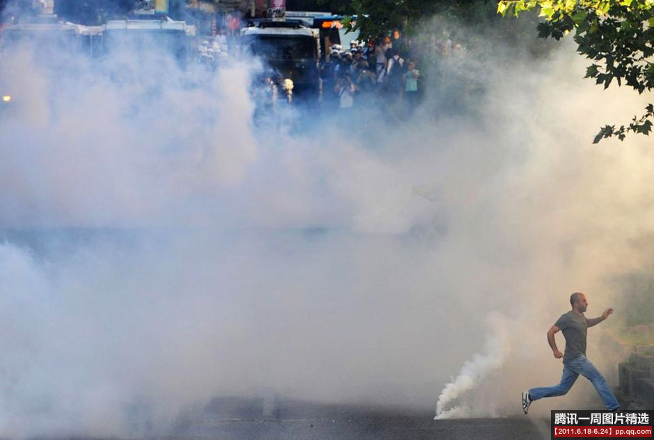 当地时间2011年6月22日,土耳其伊斯坦布尔,库尔德人和防暴警察发生冲突,一名示威者在催泪弹的烟雾中奔跑。