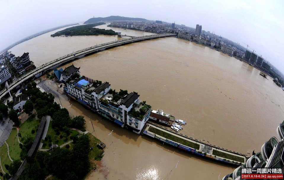 连日来的暴雨引发浙江多地受灾严重,浙江兰溪市兰江水位猛涨,造成兰溪56年以来最大洪灾,兰江多地出现管涌、决口,洪水使兰溪市的整个城区变成泽国。图为6月20日的航拍,三条江汇聚的洪峰抵达兰溪城区。