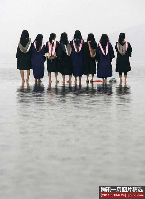 6月21日,连日的暴雨过后,武汉东湖水位猛涨,湖边的亲水平台大部已浸没在湖水中,身穿学位服的大学毕业生站在湖面上摆出各种造型拍照,远看上去好似在湖面行走,犹如“凌波微步”。有网友调侃:“大学四年没白读,走之前,我们终于练成绝世武功——轻功水上漂。”