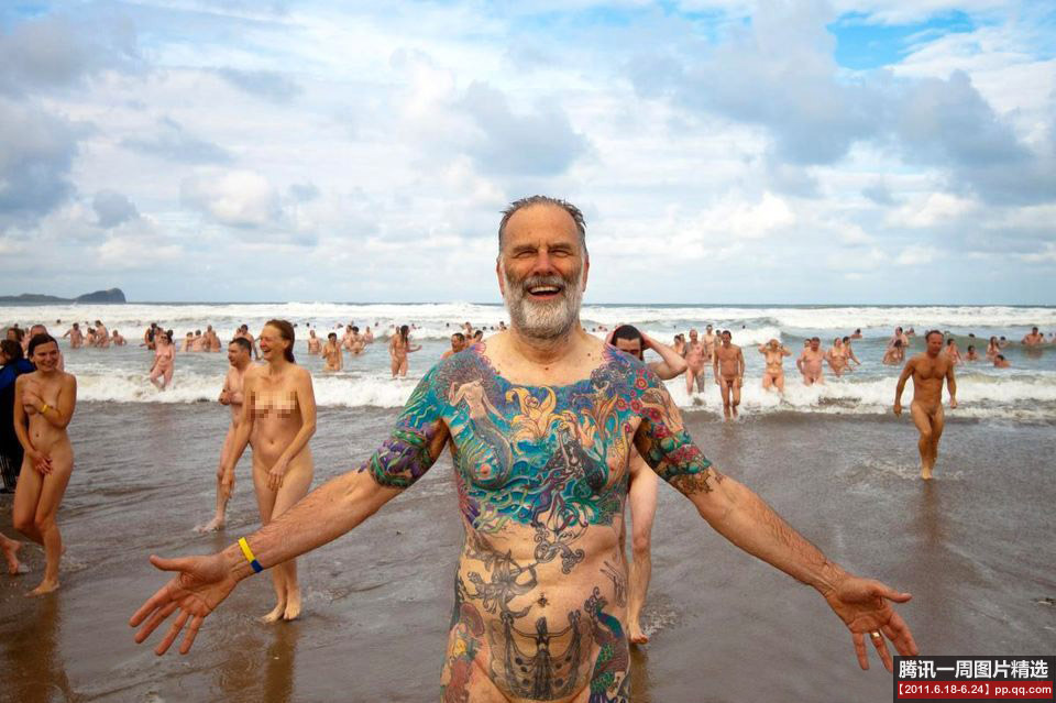 当地时间2011年6月19日,英国Rhossili海滩,裸体游泳者打破之前250人同时裸体下水的纪录,他们必须站在齐腰深的水中超过10分钟才能打破这项世界纪录。