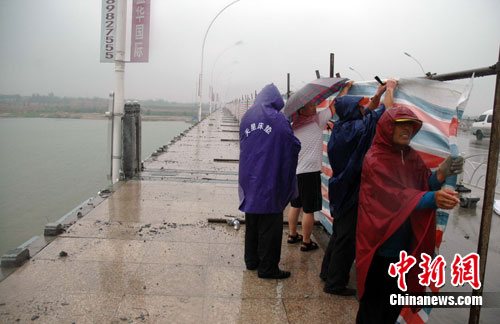 图为大风吹垮的桥栏已被清理,工人们在冒雨加装围挡。