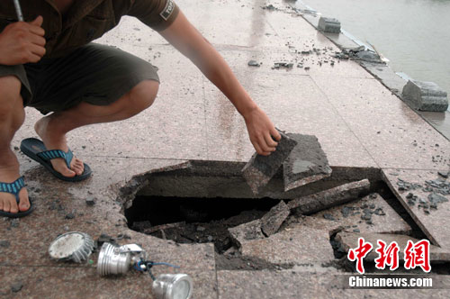图为桥栏垮塌时砸坏了人行道地面,损坏了灯光设施。