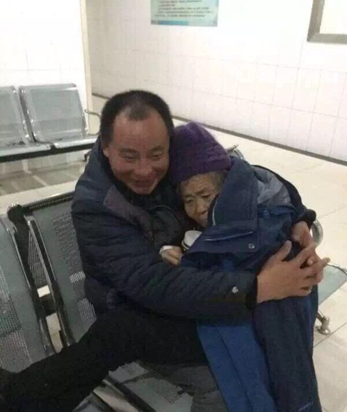 费县人民医院CT室外候诊区,男子怀抱母亲(图片来源于网络)
