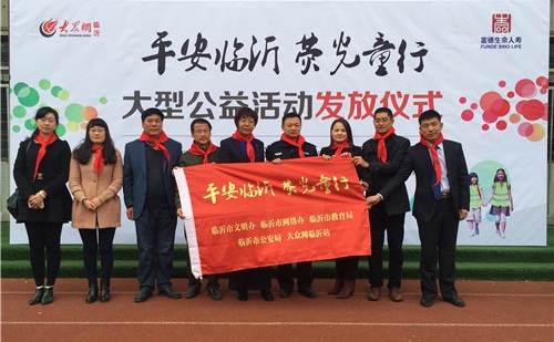 相关领导为“平安临沂 荧光童行”大型公益活动第11批荧光衣发放仪式执旗