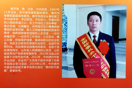 黄平亮是新时期检察官的优秀代表。从事检察工作30多年来,他始终对党忠诚,顾全大局,恪尽职守,公正执法,特别是在身患重病的情况下,仍坚守岗位,顽强与病魔抗争,积极维护国家、集体和群众的合法权益,为检察事业发展作出了重要贡献。为深入学习宣传黄平亮同志的先进事迹,大力弘扬社会主义核心价值观,省委宣传部决定,授予黄平亮同志“齐鲁时代楷模”荣誉称号。