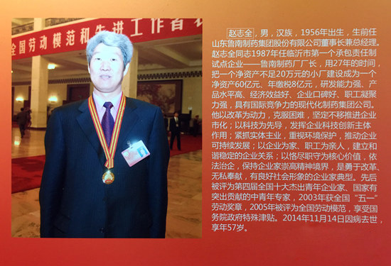 赵志全生前任山东鲁南制药集团股份有限公司董事长兼总经理。他用27年的时间,把一个校办小厂建设成为具有国际竞争力的现代化制药集团公司,为促进地方经济发展作出了突出贡献。他的先进事迹充分体现了改革创新、勇于担当、敬业奉献、造福社会的价值追求和精神风貌,树立了企业家的良好社会形象,是新时期沂蒙精神的集中体现。为深入学习宣传赵志全同志的先进事迹,大力弘扬企业家精神,省委宣传部决定,追授赵志全同志“齐鲁时代楷模”荣誉称号。