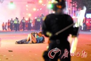 本报讯 最近,加拿大温哥华爆发球迷骚乱,防爆警察到现场镇压。其间,一对情侣被拍到躺在地上拥吻,与周遭剑拔弩张的气氛形成强烈反差。