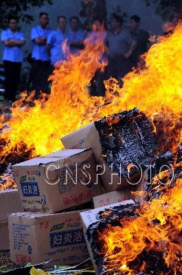 山东郯城集中销毁千余箱山寨名牌卫生巾