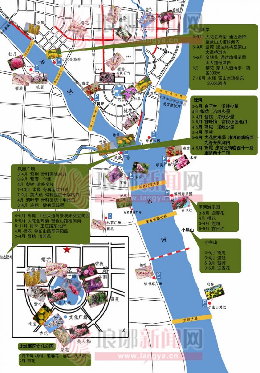 春天在哪里,春天在哪里,春天在那繁花盛开的滨河景区里。3月下旬以后,临沂滨河景区将迎来一年中最美的赏花季节,杏花、樱花、碧桃、紫薇、连翘、紫荆等各色花木竞相开放,4月初,将进入最佳观赏期。记者从市园林局获悉,为方便市民踏青赏花,汇编了赏花地图和赏花表,标明了花卉名称、开花时间、赏花地点,市民只需要按图索骥,即可尽享美景。