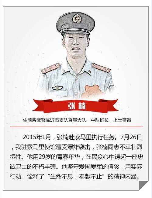 在中国驻索马里大使馆所在酒店恐怖袭击中牺牲的武警山东总队临沂支队上士张楠获评“山东好人”2015十大年度人物,他生前的战友代他领奖。