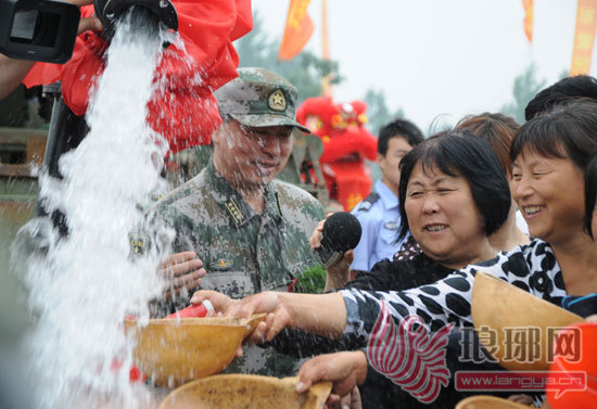 随着北京军区内蒙古军分区给水工程团在沂南县张庄镇周家峪子村打井成功出水,北京军区给水工程团抗旱打井任务圆满完成。6月26日,我市社会各界干部群众举行隆重仪式,热烈欢送赴沂蒙老区抗旱打井的北京军区给水工程团。