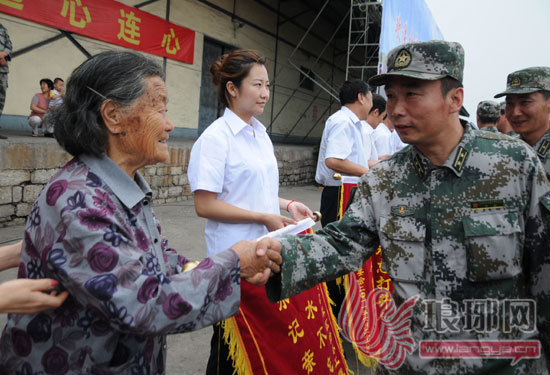 沂蒙六姐妹之一的伊淑英老人,在亲人的搀扶下,代表两位老姐妹张玉梅、伊廷珍,给打井官兵送上锦旗。