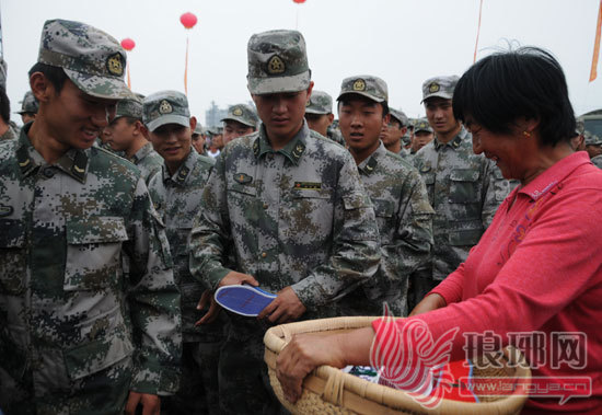 村民拿出自己亲手缝制的鞋垫送给亲人解放军。