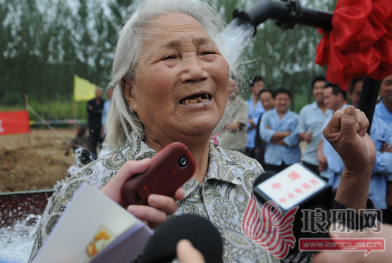 6月26日上午,84岁的薛淑吉老人和女儿一起来到了抗旱打井官兵为周家峪子村打出的甘泉前,看着水流不断从井口中喷出,蜿蜒流向干涸的土地中,老人激动万分,拿起水瓢接下甘露,放在嘴里品尝,也不知道是心甜,还是水甜,薛淑吉老人的笑容一直没有间断。