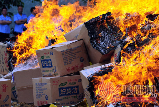 当日,山东省临沂市郯城县公安、工商、技术监督等部门联合开展集中销毁山寨名牌卫生巾行动,共销毁高仿“妇炎洁
