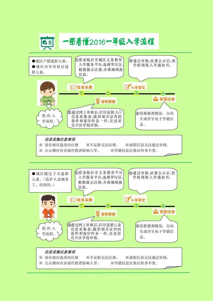 (一)凡年满 6 周岁(2010 年 8 月 31 日以前出生)拟在我 市入学的适龄儿童,均需参加学龄人口信息采集,免试划片入学,残疾儿童可适当推迟入学年龄。今年我市城区(兰山区、罗庄区、河东区、临沂经济技术开发区、临沂高新技术产业开发区)适龄儿童报名入学,均需在“临沂市城区义务教育入学服务平台”进行信息采集。有条件的县区,也可以使用此服务平台报名。市教育局直属义务教育阶段学校招生工作,由兰山区统一组织实施。