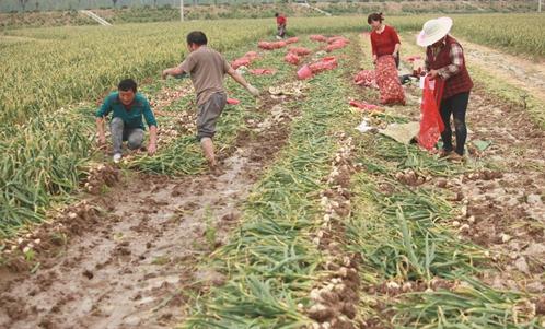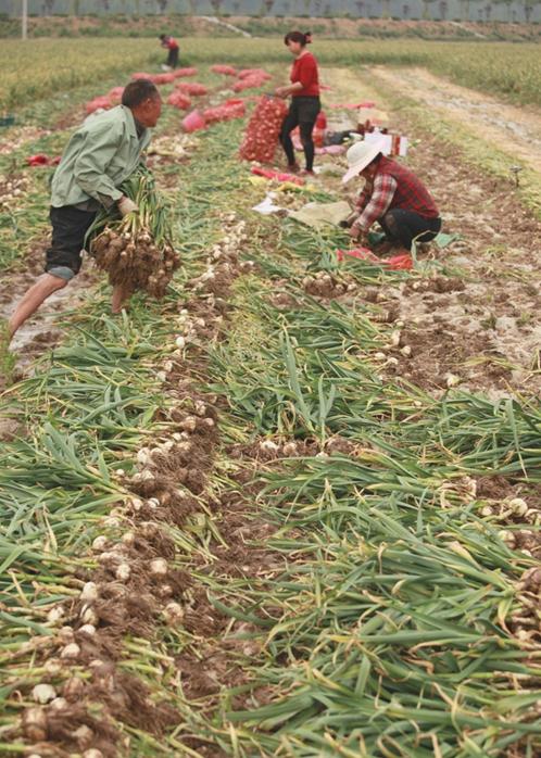 2016年5月9日,在山东省临沂市平邑县温水镇梭庄村,村民在忙碌着收获新蒜。