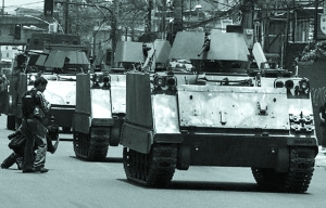 直升机在头顶尖锐呼啸,军人和警察全副武装把守路口,装甲车轧过破损不堪的路面,发出嘎吱嘎吱的响声。除了宿醉的流浪者,街上空无一人,两边板房的窗户里,偶尔探出一个脑袋,又立刻缩回去。伴着清晨的曙光,高音喇叭在喊话:“政府准备搜查曼古埃拉,清理犯罪分子,请居民们配合、举报,我们会帮助你们的。”这种风声鹤唳的场面不是电影,而是发生在巴西第二大城市里约热内卢贫民窟里真实的一幕。