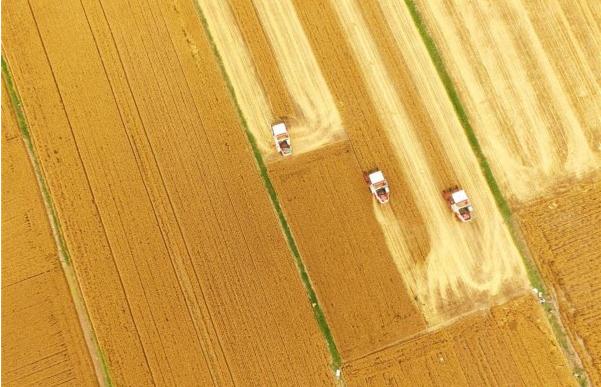 6月2日,人们驾驶收割机在山东省临沂市郯城县郯城街道陵坡村田间收割小麦。近日,山东各地小麦陆续进入收获期,田间麦香四溢,遍地金黄。