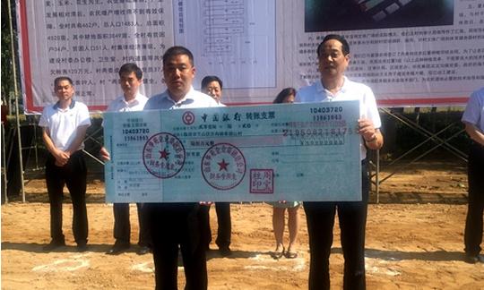 华苑集团董事长周宝柱将60万元“支票”交给柴胡山行政村“第一书记”杨勇