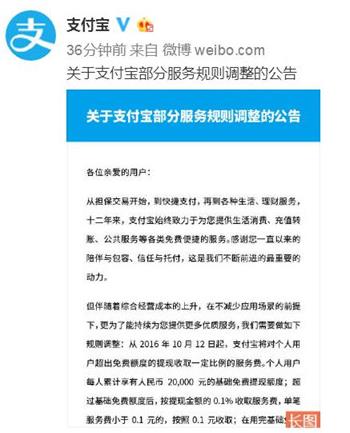 9月12日,第三方支付平台支付宝宣布从自2016年10月12日起,对个人用户超出免费额度的提现收取0.1%的服务费,个人用户每人累计享有2万元基础免费提现额度。