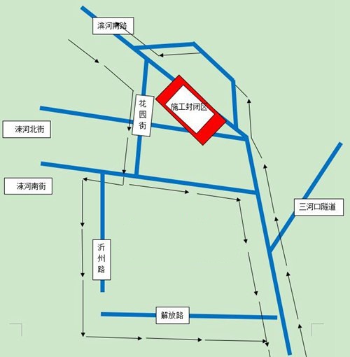 据了解,施工区域由(西北)花园街至(东南)涑河北街区间内滨河路封闭施工,由东南向西北通行车辆请绕行封闭区右侧广场景观路通过,由西北向东南辆请绕行花园街、涑河南街通过或绕行花园街、涑河南街、沂州路、解放路通过。施工势必对交通造成影响,请过往车辆尽量选择绕行。
