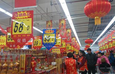 包装精美的酒水是今年超市促销的主打商品,被摆放在超市的主通道上,贴有“第二件0.01元”“买一送一”“满300元换购1件商品”等促销标语,吸引众多顾客驻足观看。某大型超市的销售人员告诉大众网记者,不管是团购还是零售,价格在二百元至伍佰元之间的中档酒水最受消费者欢迎,在春节期间酒水的销售量可以上涨几倍不止。为满足在春节前的最后一波销售高峰期顾客的销售需求,他们早在一个月前就已将货备足。