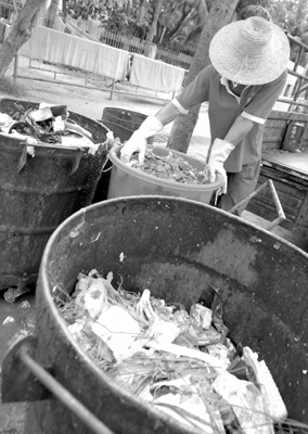 养猪场的工人正在海口市一酒店外收泔水。新华社记者 侯建森 摄