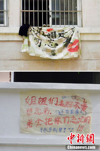 该校40栋女生宿舍楼北面,一床被单挂在某寝室阳台上迎风飘扬,被单上赫然写着“弟,姐走了,勿忘我”几个黑色大字。与该阳台相对的41栋男生宿舍楼窗外,正好也贴着一张写满“离别寄语”的白纸,上面用红色字体写着“姐姐们走好,不要留恋弟(还有后来人),弟会把你们忘记的!”末尾还写着“手机号别留了”的字样。乍一看,两条横幅正好相对,上演了一出学姐与学弟之间的“离别戏”。
