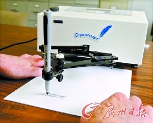 奥尔丁介绍,每台自动签名机售价在2000美元至1万美元之间。旧式机器有桌子那么大,一般门廊塞不下;新一些的版本配有微处理器和数字控制系统,能摆放在办公桌上。