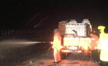 凌晨,郯城分中心在沂河大桥喷洒液体融雪剂,防止桥面结冰