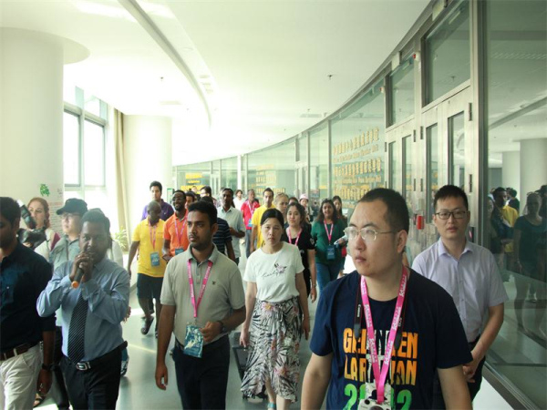 随后,在中印专家队伍的带领下,留学生们来到了创客中心。无巧不成书,一支来自临沂市的小学生队伍正在创客中心内进行综合实践,两支队伍随即展开了热切的交流,并共同体验创客中心内的各个项目。整个上午,莲花状的山东智慧教育创客中心内,充满了来自五湖四海不同肤色的小朋友和大朋友们的欢声笑语。