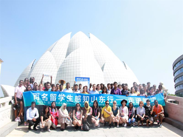 十时许,留学生队伍结束了在创客中心的体验,队伍来到莲花楼(山东智慧教育创客活动中心)前进行了合影留念。