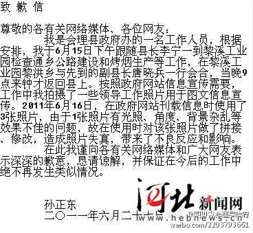 按照政府网站信息宣传需要,孙正东在工作中拍摄了一些领导工作照片用于图文信息宣传。2011年6月16日,在政府网站刊载信息时使用了3张照片,由于1张照片有光照、角度、背景杂乱等效果不佳的问题,故在使用时对该张照片做了拼接、修改,造成照片失真,带来了不良反应和影响。“在此我谨向各有关网络媒体和广大网友表示深深的歉意,恳请谅解,并保证在今后的工作中绝不再发生类似情况。”孙正东称。