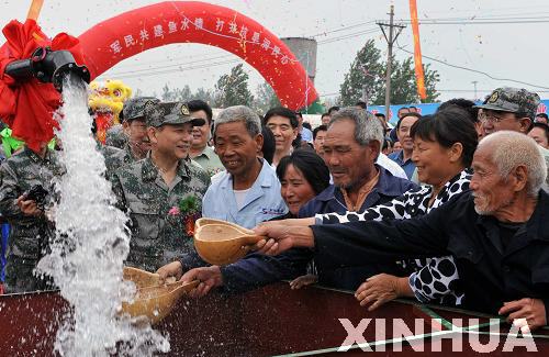 去年入冬以来,我国华北、黄淮部分地区出现了长时间干旱,山东临沂、河北邯郸等地区旱情更是百年一遇。今年2月,北京军区调集给水团精干力量和先进机械设备,千里驰援,帮助打井。经过120多天的艰苦奋战,给水工程团在临沂钻井总进尺近2.5万米,成井188眼,解决了448万人的生产生活用水和36万亩农田的灌溉问题。