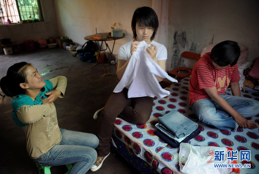 马树芝(中)带回同学送的衣服,她的妹妹(左一)已经迫不及待穿了起来。