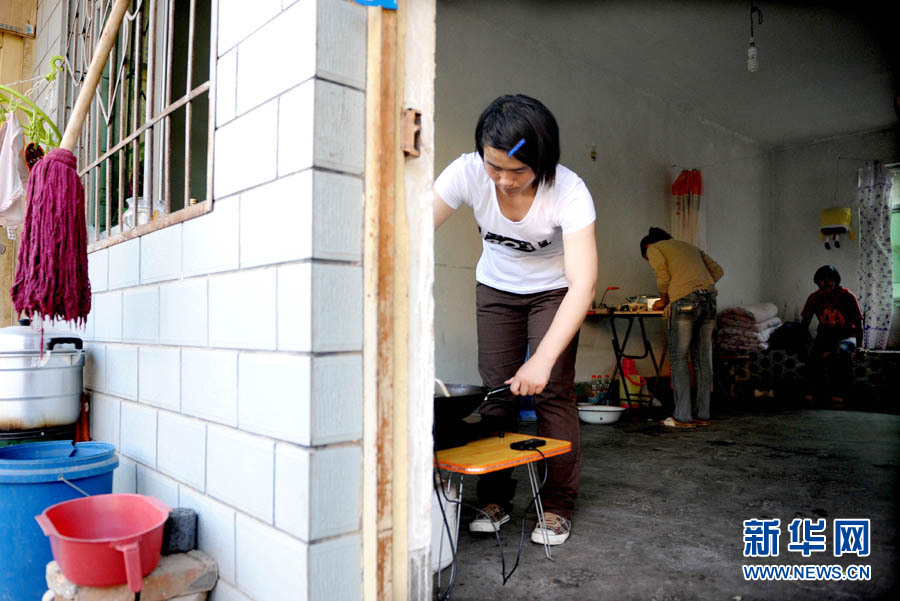 马树芝(前)和妹妹一起做晚饭,因为没什么家具,做饭的厨具只能放在地上(6月27日摄)。