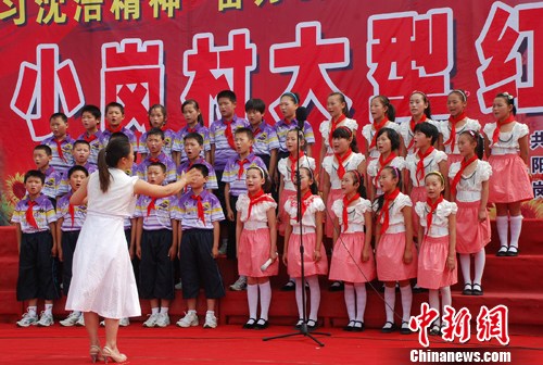 6月25日上午,安徽省凤阳县小岗村近1000名村民、企业员工早早来到“大包干”纪念馆前,一起参加“学习沈浩精神、奋力争先创优、庆祝建党90周年”大型红歌会。图为小岗村小学生们高唱“没有共产党就没有新中国”。马顺龙 摄