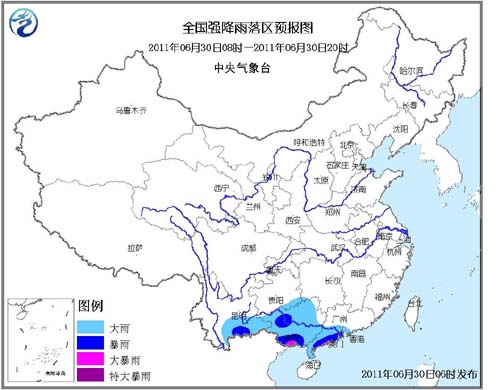 中央气象台6月30日06时继续发布暴雨蓝色预警:预计,6月30日08时至20时,广西大部、广东西南部、云南南部、贵州东南部有大到暴雨,其中,广西南部、广东西南部的局部地区有大暴雨。