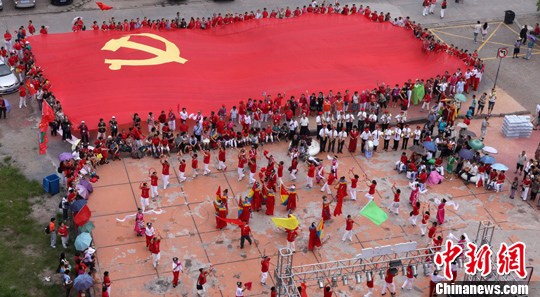 6月27日,长30米、宽20米、共600平方米的巨幅党旗现身重庆洋人街。图为一表演团队在巨幅党旗前载歌载舞庆祝建党90周年。刘函冉 摄