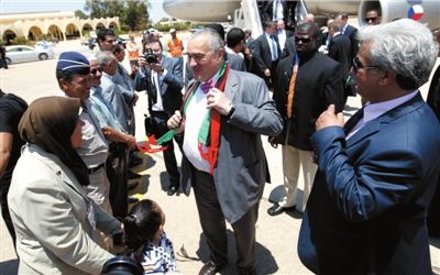 6月29日,捷克外长施瓦岑贝格(中)访问班加西,戴着利比亚反对派旗帜颜色的围巾。 图/人民图片