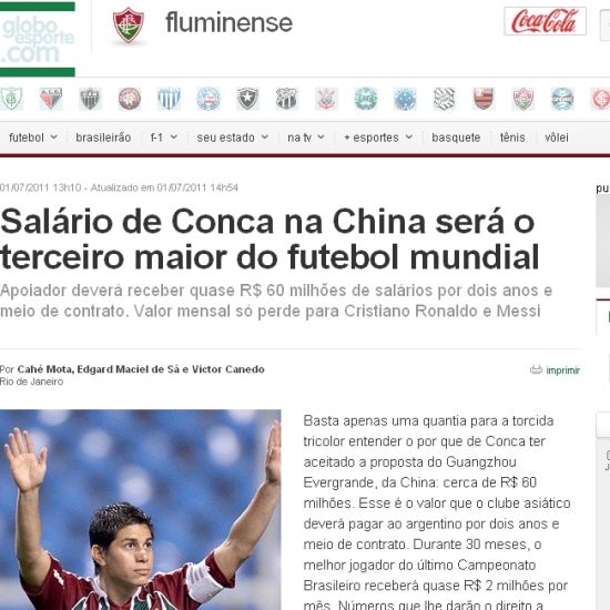 新浪体育讯 就在昨天,巴西多家权威媒体证实了巴西联赛MVP达里奥-孔卡将确定加盟中超广东恒大,消息一出震惊国内足坛。今天,巴西《环球体育》再爆惊人猛料,恒大为孔卡开出的将是世界第三高年薪——30个月,6000万雷亚尔(雷亚尔,巴西货币,1雷亚尔=0.4415欧元)!两年半时间的合约内,换算过来孔卡将得到接近2650万欧元,年薪将达到1037万欧元,仅逊于皇马的C罗和巴萨的梅西。 在巴西,很难想象孔卡能加盟中国联赛,淘金是唯一说得通的理由,但恒大究竟开出多大的账单,招揽这位弗鲁米嫩塞的头牌球星?答案让人瞠目结舌!30个月,接近2650万欧元!这样的天价年薪仅仅落后于梅西和C罗两位国际巨星。C罗目前能拿到1200万欧元的年薪,而梅西在巴萨年薪约为1050万欧元。 弗洛米嫩塞的主帅阿贝尔-布拉加也被恒大开出的天价所震惊。他表示这是恒大第三次为孔卡开价,此前两次,孔卡都拒绝了恒大提出的待遇和条件,“就像他此前的拒绝一样,做些改变接受这个提议也是可以理解的,他需要为他自己和他的家庭考虑些更实际的东西。” 回头再看看世界足坛年薪排名,即将加盟广州恒大的孔卡已经悄然间名列前茅。 来源:新浪体育